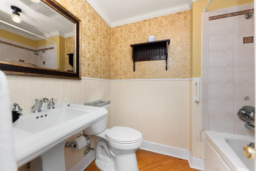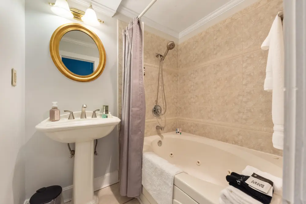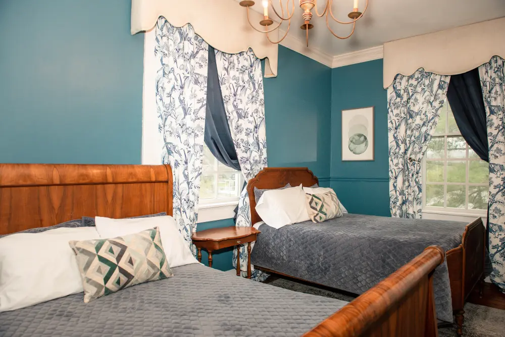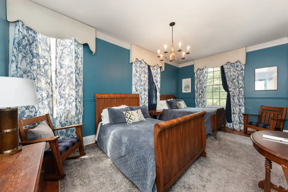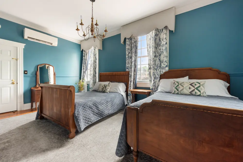 The Lamplighter Adjoining Rooms offers a spacious and comfortable stay, perfect for families or groups. This unique accommodation consists of two adjoining rooms—one with a king-size bed and the other with two full beds—connected by a shared bathroom located within the king-bed room. Featuring antique furniture that reflects timeless elegance, this room is named in honor of the hotel’s history as the Lamplighter Inn, blending classic charm with modern comfort.