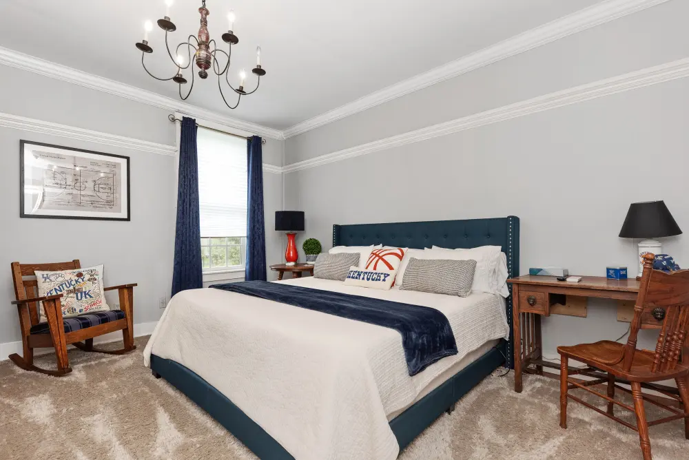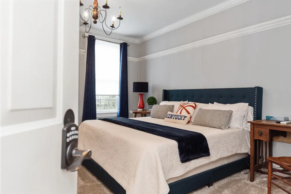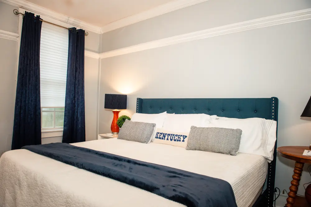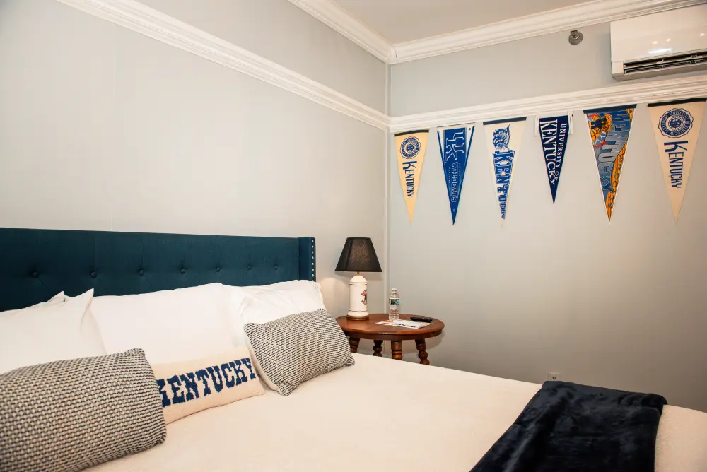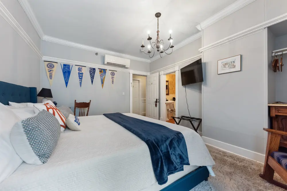 A must-stay for any University of Kentucky fan, the Wildcats Room is a spirited tribute to UK basketball. Located on the second floor, this room features a spacious king-size bed and a private en-suite, offering both comfort and team pride. The décor is tastefully inspired by the Wildcats, blending team pride and sophisticated style with classy touches that honor UK’s storied basketball legacy. Whether you’re visiting for a game, a getaway, or just to show your Big Blue Nation spirit—this room is the perfect home court advantage. Go Wildcats!