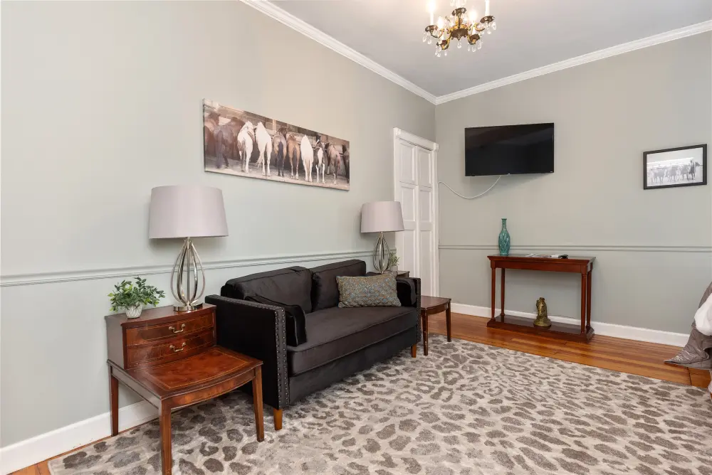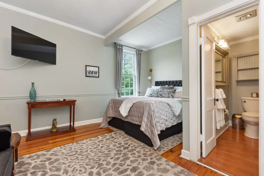 The Derby Room is a uniquely designed space that celebrates Kentucky’s legendary horse racing tradition. Decorated with elegant touches inspired by the Kentucky Derby, this room features a queen-size bed, a private en-suite, and a formal sitting area. Perfect for guests seeking both comfort and a taste of Kentucky’s equestrian culture, the Derby Room blends sophisticated design with a nod to one of the state’s most celebrated events. Whether you’re a racing enthusiast or simply seeking a relaxing retreat, this room offers a charming and inviting atmosphere.
